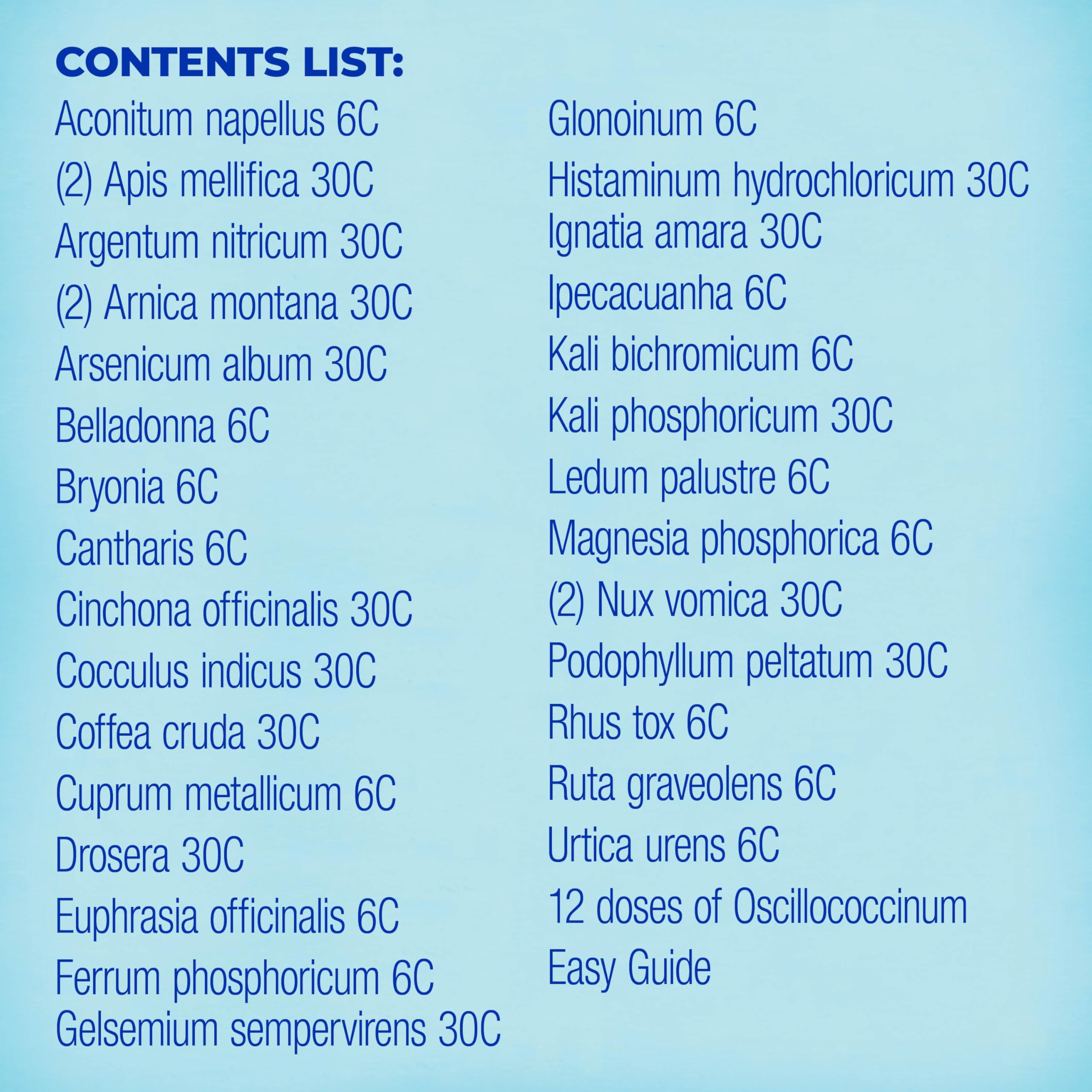 - Includes aconitum napellus 30C; apis mellifica 30C; Arnica Montana 30C; arsenicum album 30C; Belladonna 6C; cinchona officinalis 30C; cocculus indicus 6C; coffee cruda 30C; colocynthis 6C